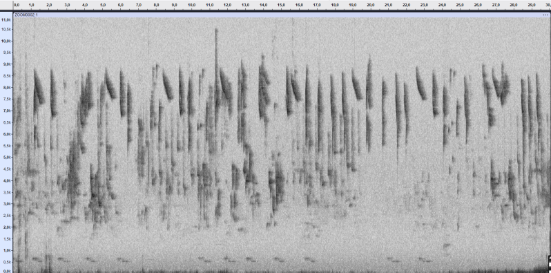 - Cri de contact : les oiseaux sont assez haut dans les arbres. C'est un "tsii" très aigu (7,2 kH) avec un deuxième ton à peine moins aigu (7 kH).