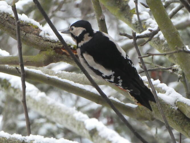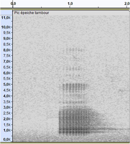 - Tambourinage du mâle. Le pic épeiche n'est pas un chanteur, c'est un percussionniste. Il frappe avec son bec des branches sonores. Le tambourinage dure de 0.4 à 0.8 seconde pour un nombre de coup variables, de 11 à 18 sur les exemples ci-dessous. Le son est décroissant, il dépend de la branche choisie, chaque oiseau a ses favorites. J'ai vu un pic épeiche venir jour après jour frapper une boîte en plastique en haut d'un poteau de ligne téléphonique. Tous les goûts sont dans la nature!