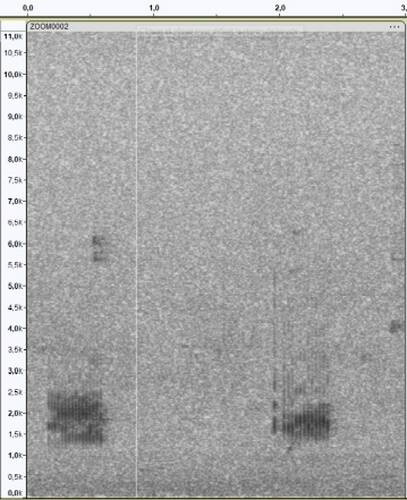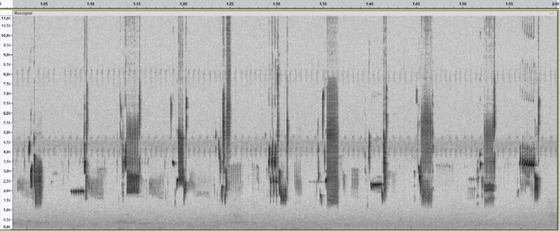 - 3mn de chant d'un mâle (une seule prise divisée en trois sonagrammes d'une minute, pour plus de lisibilité), on entend la réponse d'un voisin. L'oiseau chante toujours caché, assez bas dans un fourré, le jour mais aussi longuement la nuit.